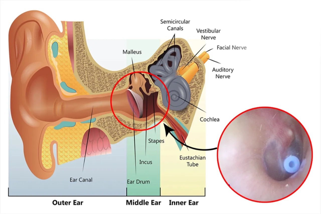 A minor surgical procedure involving a small incision in the eardrum and insertion of a ventilation tube to relieve fluid build up in the middle ear