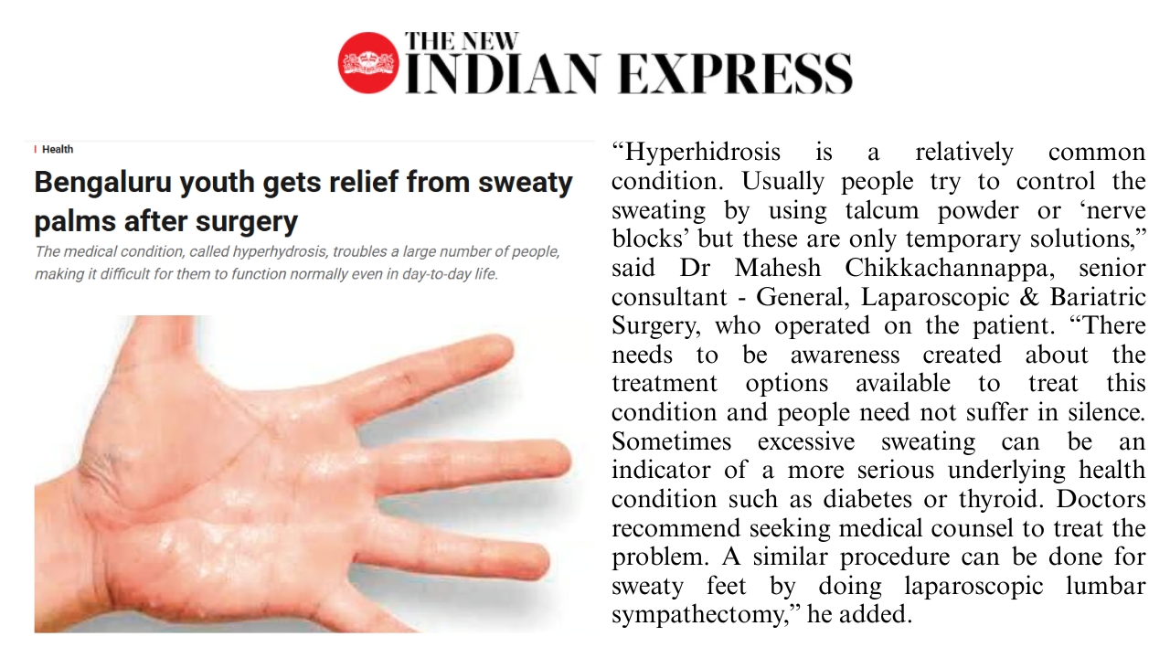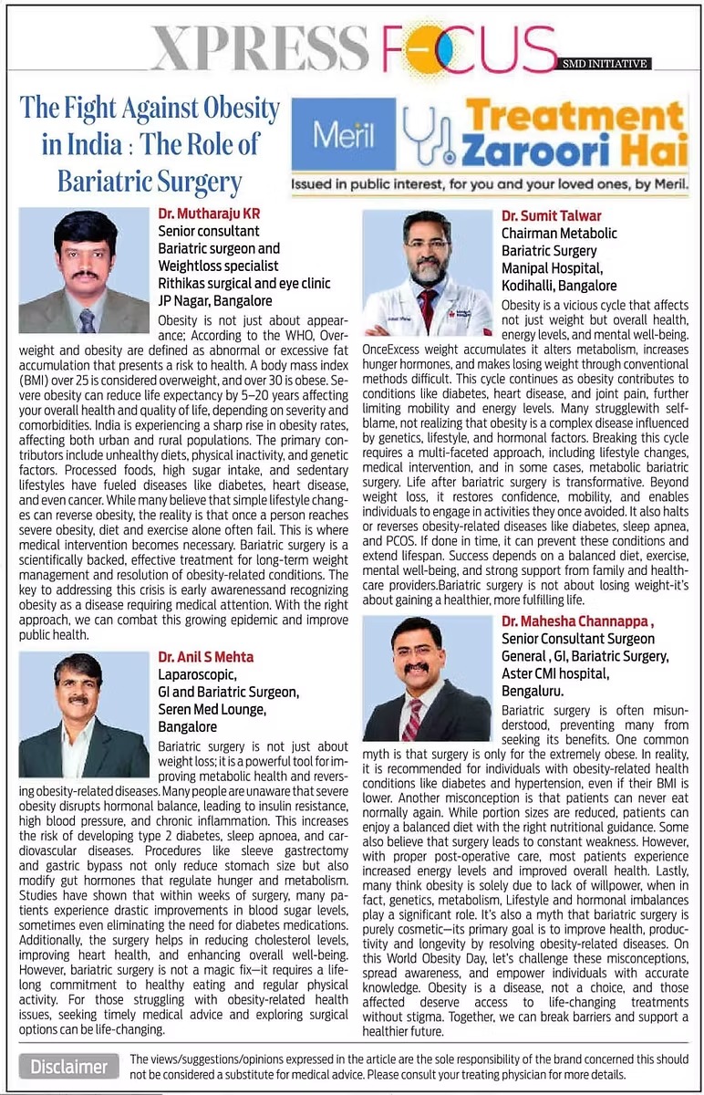 Dr. Mahesh Channappa was quoted in The New Indian Express industry feature on "Fight Against Obesity" on page 03 of the Bangalore edition.