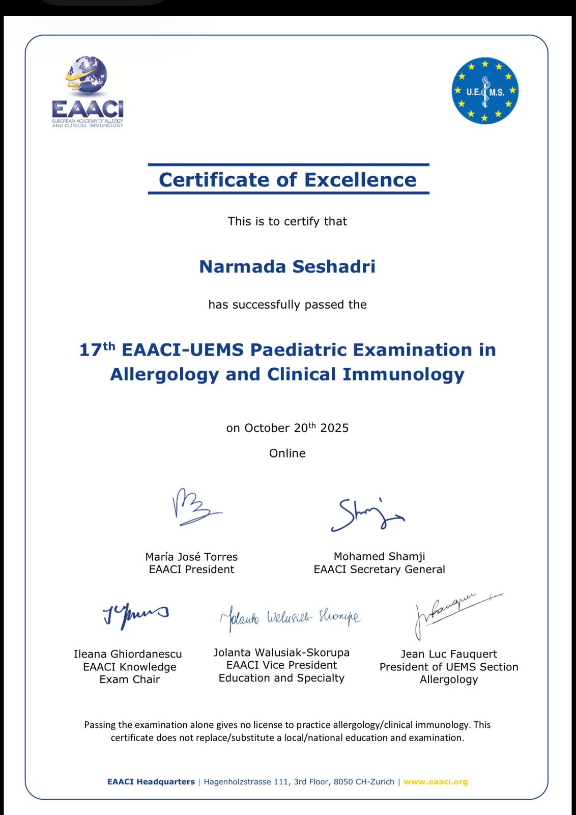 Dr. S. Narmada Ashok has successfully cleared the 17th EAACI-UEMS Paediatric Examination in Allergology and Clinical Immunology, demonstrating outstanding expertise in the field.