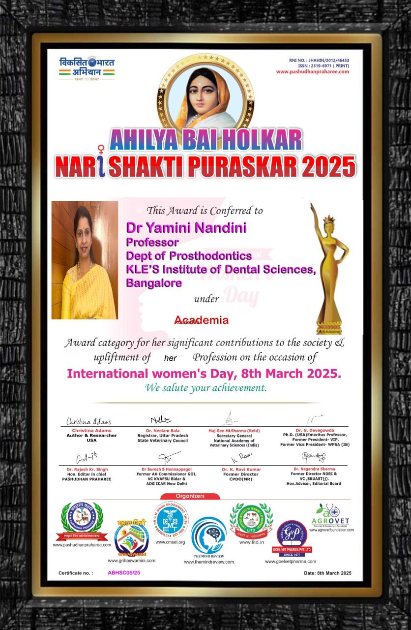 Dr. Yamini Nandini was awarded the Ahilya Bai Holkar Narishakti Puraskar Award, 2025 under Academia, for her significant contribution to the society and upliftment of her Profession on the ocassion of International Women's Day