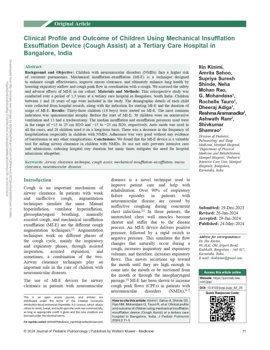 1.Clinical profile and outcomes of children using mechanical Insufflation and Exsufflation device (cough assist) at a tertiary care hospital in Bengaluru, India Journal of Pediatric pulmonology, 2024.