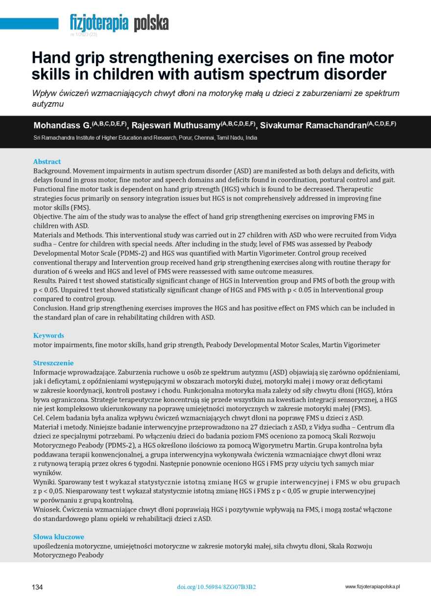 2.Hand grip strengthening exercises on fine motor skills in children with autism spectrum disorder , Polish journal of physiotherapy , 2023.